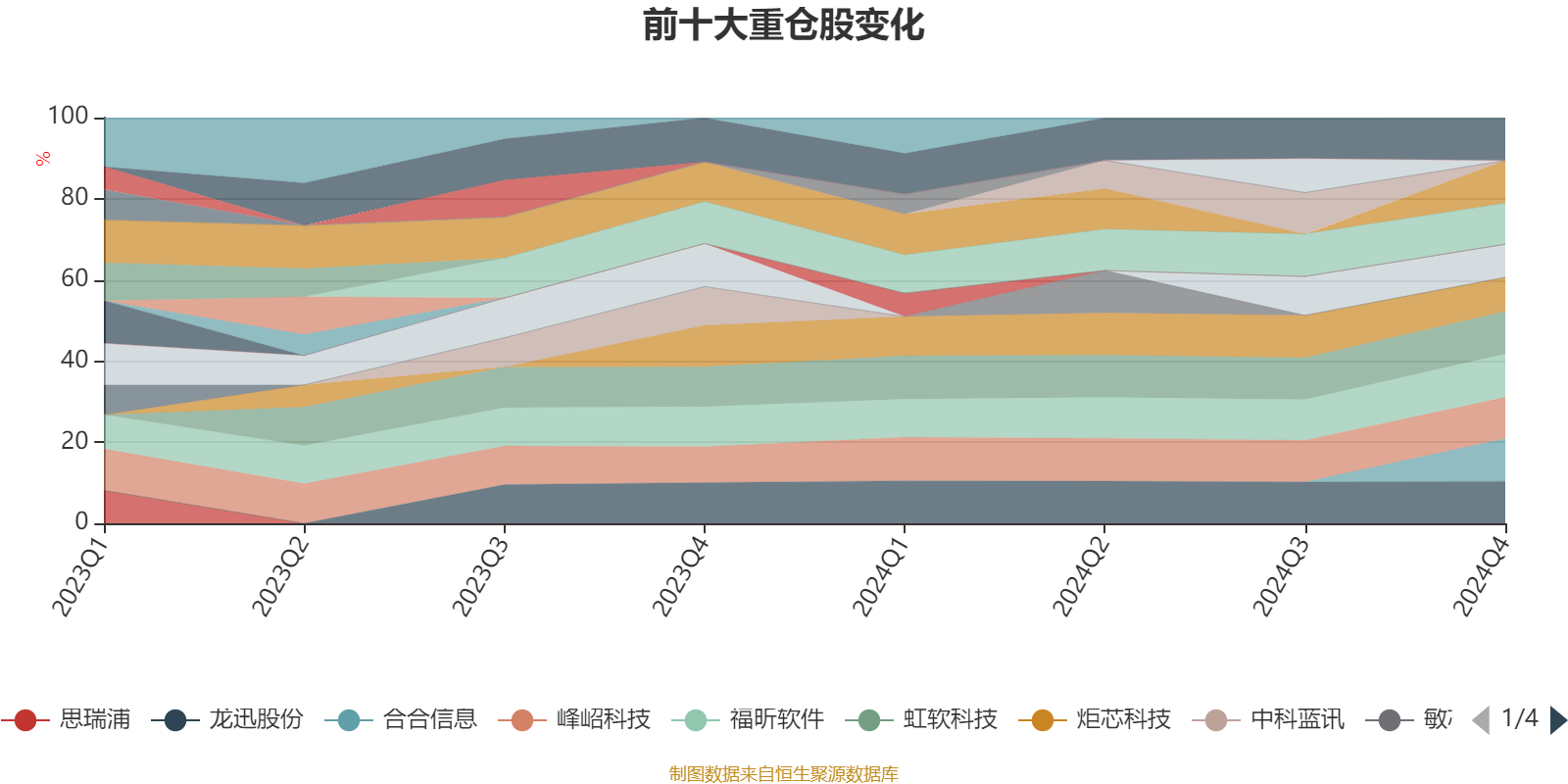 该基金持股集中度较高,近2年前十大重仓股集中度长期超过60%。截至2024年四季度末,基金十大重仓股分别是福昕软件、合合信息、虹软科技、恒玄科技、裕太微、龙迅股份、峰岹科技、芯动联科、炬芯科技、臻镭科技。